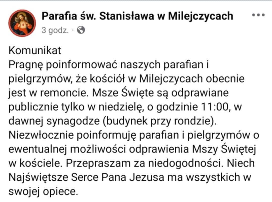 W komunikacie czytamy:"Pragnę poinformować naszych parafian i pielgrzymów, że kościół w Milejczycach obecnie jest w remoncie. Msze Święte są odprawiane publicznie tylko w niedzielę, o godzinie 11:00, w dawnej synagodze (budynek przy rondzie). Niezwłocznie poinformuję parafian i pielgrzymów o ewentualnej możliwości odprawienia Mszy Świętej w kościele. Przepraszam za niedogodności. Niech Najświętsze Serce Pana Jezusa ma wszystkich w swojej opiece."