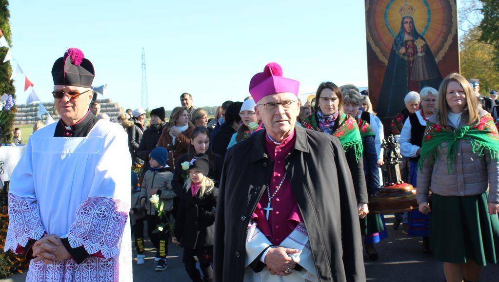 Mszy świętej przewodniczył biskup Kazimierz Gurda, który w homilii wyraził zadowolenie, że wśród przybyłych na powitanie Świętych Znaków jest tak wiele dzieci, że otoczyły niesiony obraz Matki Bożej i niesione relikwie naszych męczenników. - To wydarzenie w ich życiu bardzo ważne i dziękuję rodzicom, że o to się zatroszczyli, że zatroszczyli się o to, by ich synowie i córki mieli doświadczenie tego dzisiejszego dnia i żeby pamiętali o tym w przyszłości. Za ileś lat, za dwadzieścia, kiedy będą już dojrzałymi ludźmi, to wtedy będą przypominać sobie, że w tym wydarzeniu, tak ważnym dla całej wspólnoty parafialnej brali udział – mówił bp Gurda i kontynuował, że może zapamiętają to, że podczas misji ewangelizacyjnych „dokonywała się przemiana tych wszystkich, którzy w nich uczestniczyli, duchowa przemiana. - Przemiana, która dokonuje się dzięki słowu, które pochodzi od Boga, słowu, które tutaj było głoszone przez ks. Jacka misjonarza przez te dni. Myślę, że to jest czymś takim bardzo ważnym, że oto słowo, które pochodzi od Boga zdolne jest do tego, aby przeniknąć nasze serca, żeby dotknąć naszych serc i żeby je przemieniać. Potrzeba jest nam dzisiaj tej duchowej przemiany, tego przylgnięcia jeszcze większego niż do tej pory do Jezusa Chrystusa i do Jego Ewangelii, bo myślę, że to jest nam dzisiaj najbardziej potrzebne, uświadomienie sobie tego, że my jesteśmy wszyscy wezwani, abyśmy mocno trwali przy Chrystusie – artykułował. Ksiądz biskup zaznaczył, że świadectwo, które dziś bardzo jest wszystkim potrzebne, świadczy również o pięknie wiary w Jezusa Chrystusa. - Nasi błogosławieni męczennicy, których tutaj relikwie mamy, oni przychodzą nam powiedzieć, żebyśmy nie tracili wiary wtedy, kiedy Kościół jest krytykowany. Oni należeli do Kościoła i oni ten Kościół stanowili, oni tego Kościoła bronili, za ten Kościół oddali swoje życie (…) Oni byli tymi, którzy nam mówią, żebyśmy trwali przy Kościele Chrystusowym, w tym Kościele szukali zbawienia, odkupienia – akcentował bp. Gurda.