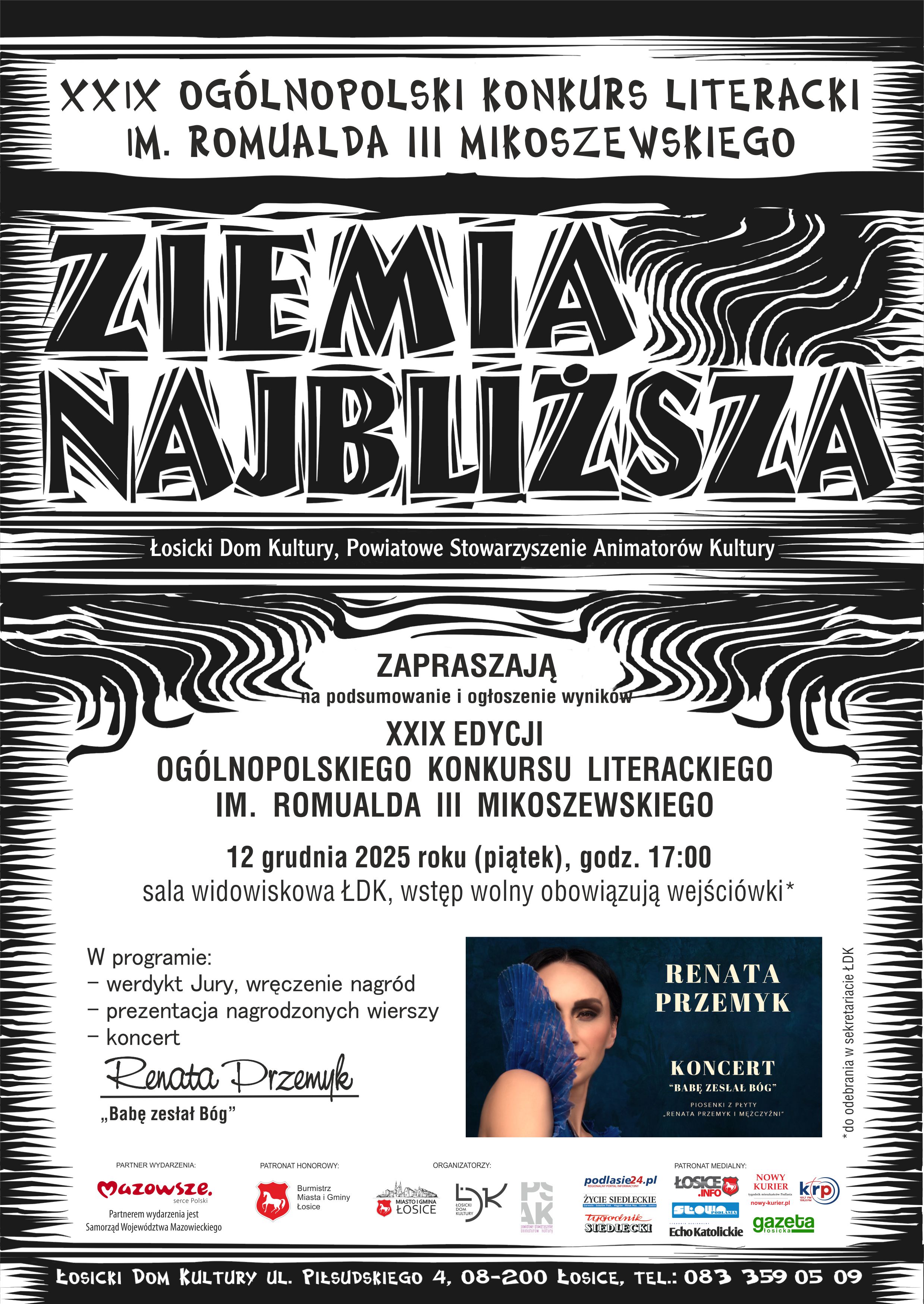 Uroczyste podsumowanie 29. Ogólnopolskiego Konkursu Literackiego im. Romualda III Mikoszewskiego „Ziemia najbliższa” odbędzie się w sali widowiskowej Łosickiego Domu Kultury.