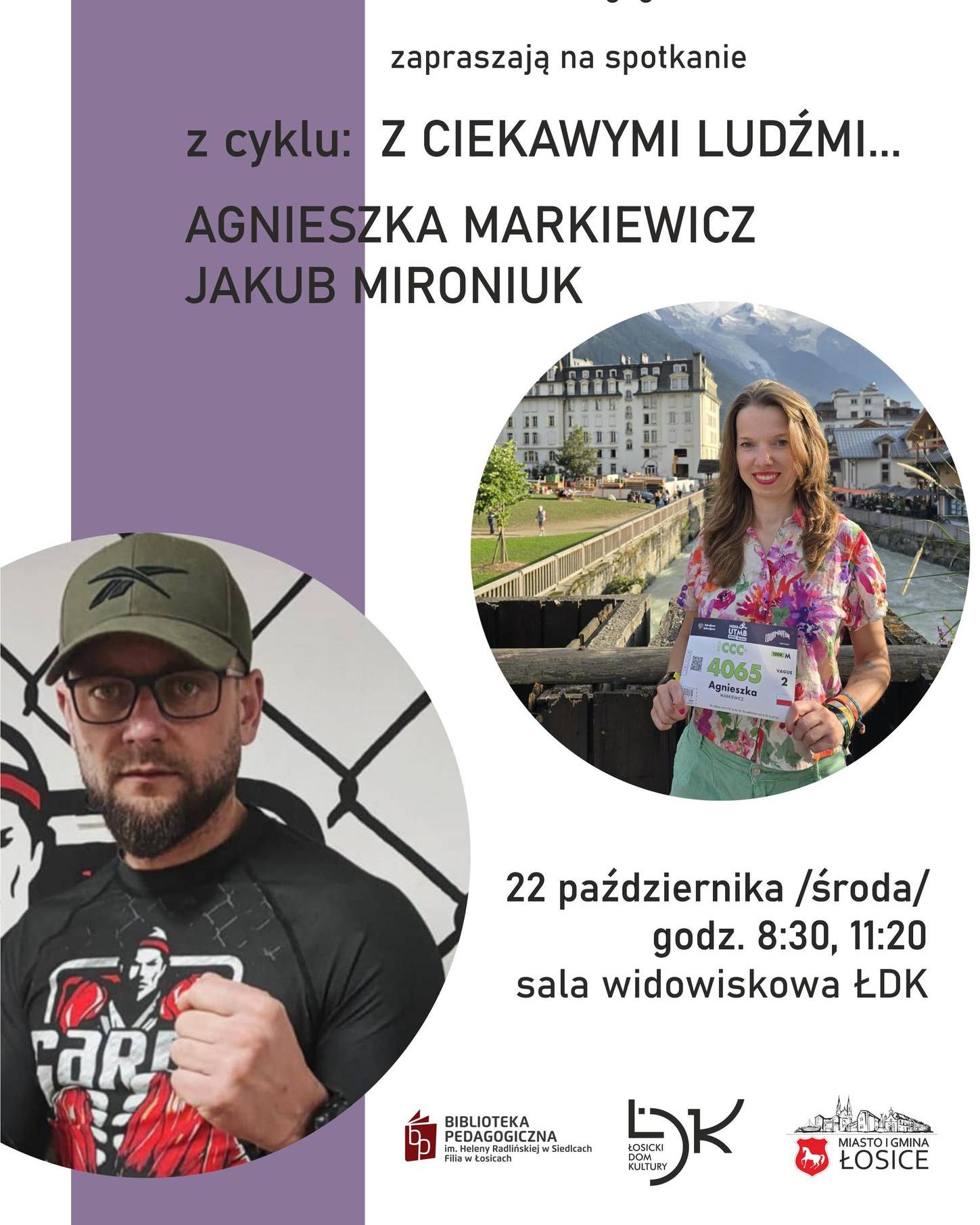 Agnieszka Markiewicz i Kuba Mironiuk będą bohaterami spotkania „Z ciekawymi ludźmi…” w Łosicach. Wydarzenie organizują w środę, 22 października, Burmistrz Miasta i Gminy Łosice, Łosicki Dom Kultury oraz Biblioteka Pedagogiczna im. H. Radlińskiej w Siedlcach – Filia w Łosicach.