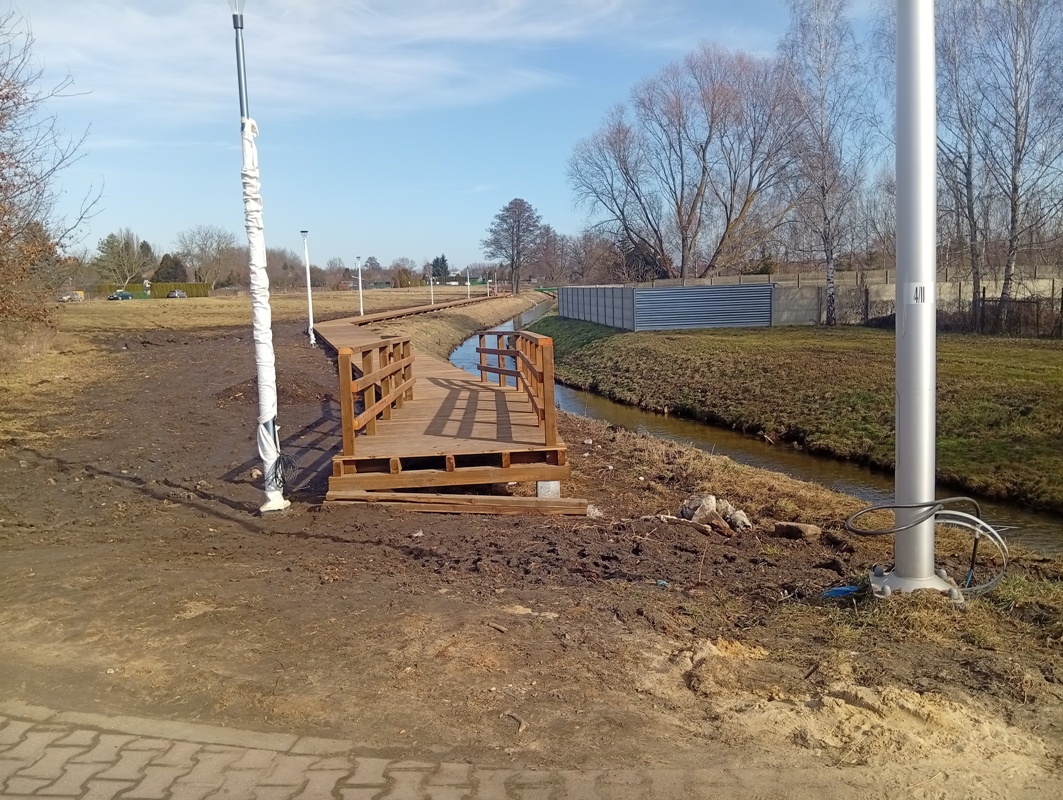 Jak informuje burmistrz Mariusz Kucewicz, zimą nastąpiła krótka przerwa w pracach, jednak obecnie inwestycja ponownie nabrała tempa. – Widać już dodatkowe elementy. Stoi konstrukcja statku, który będzie jedną z większych zabawek na placu zabaw. Z drogi widoczna jest także konstrukcja tężni solankowej – mówi burmistrz.Na ukończeniu są również drewniane ciągi piesze i kładki wzdłuż rzeki Toczna, które połączą nowe ścieżki z istniejącą infrastrukturą.