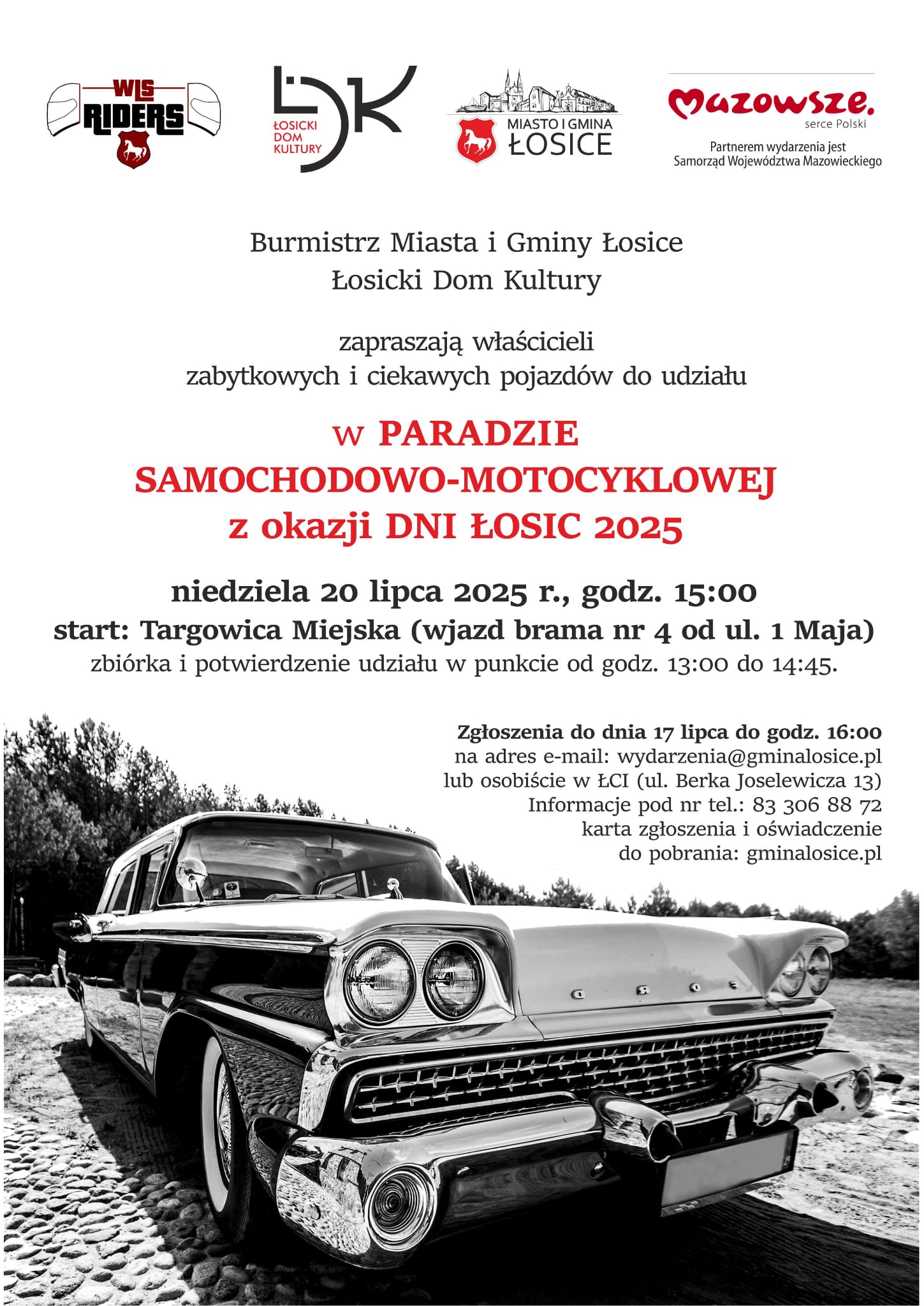 Na dzień 20 lipca zaplanowano obchody Dni Łosic. Miasto i Gmina Łosice wraz z Łosickim Domem Kultury zapraszają wszystkich miłośników czterech i dwóch kółek na wyjątkową paradę samochodowo-motocyklową.