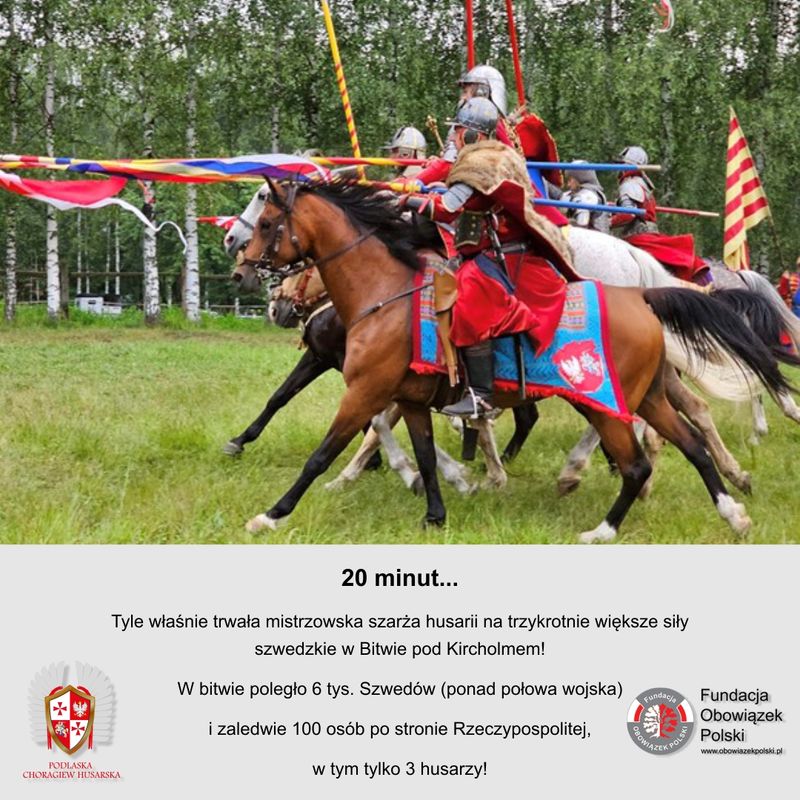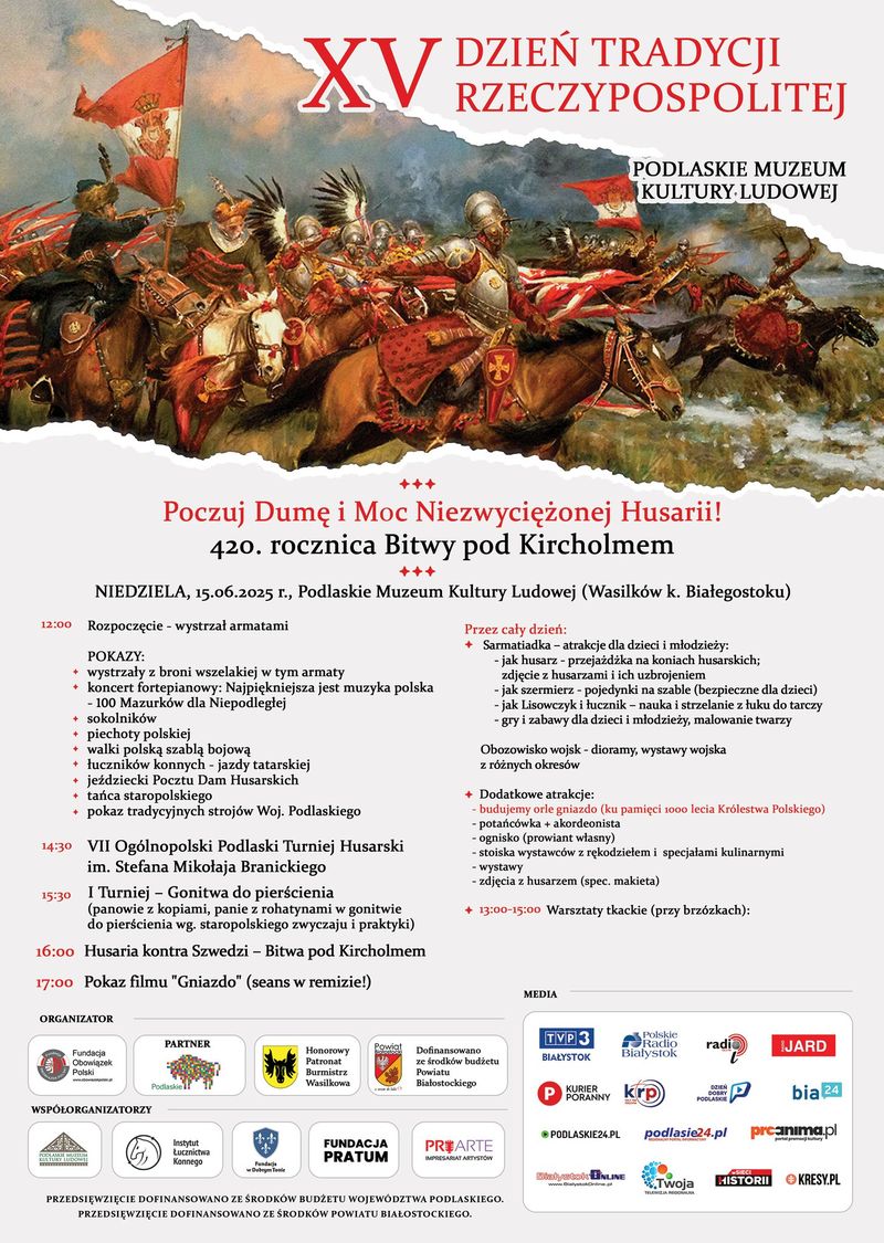 Inscenizacja zwycięskiej bitwy pod Kircholmem z 1605 roku, w której wojska Rzeczpospolitej pod dowództwem hetmana Jana Karola Chodkiewicza, rozgromiły trzykrotnie większe siły szwedzkie, będzie jednym z głównych punktów Dnia Tradycji Rzeczpospolitej. Widowisko „Husaria kontra Szwedzi – Bitwa pod Kircholmem” będzie sposobem uczczenia 420. rocznicy spektakularnej, zwycięskiej bitwy pod Kircholmem. Organizowany po raz piętnasty Dzień Tradycji Rzeczypospolitej, odbędzie się on w niedzielę, 15 czerwca na terenie Podlaskiego Muzeum Kultury Ludowej w Wasilkowie k. Białegostoku.