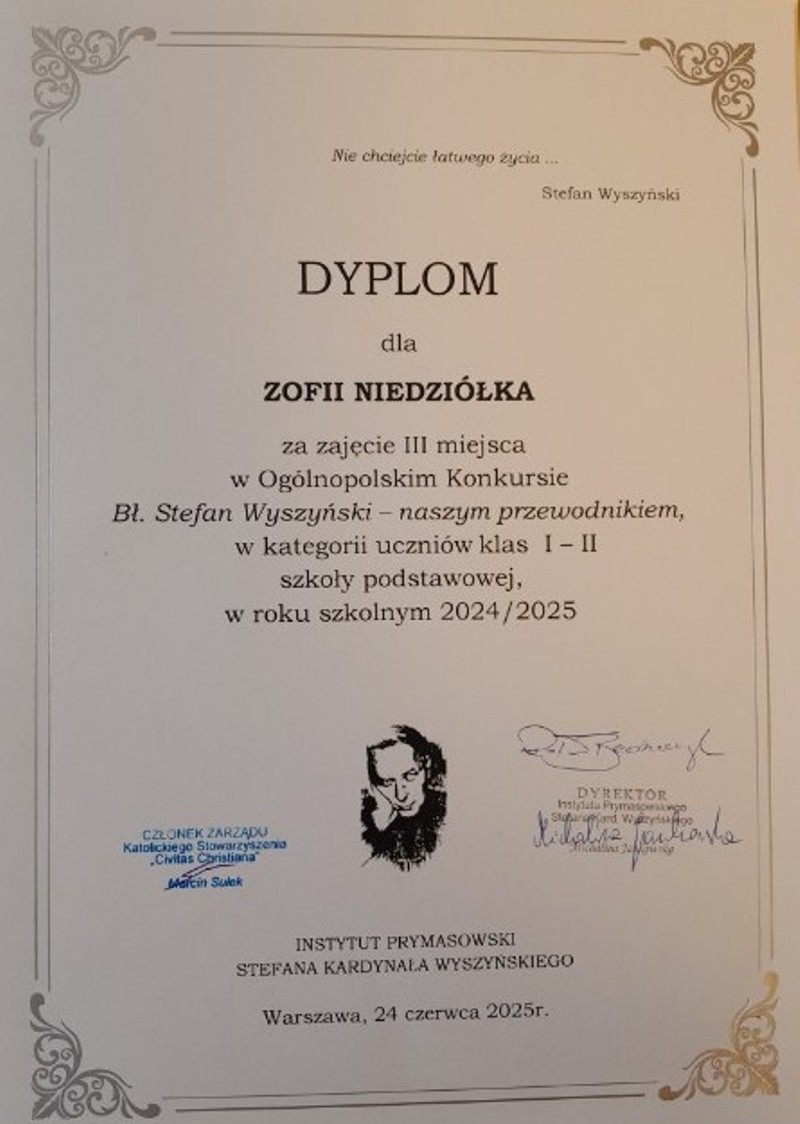 Organizatorem konkursu był Instytut Prymasowski Stefana Kardynała Wyszyńskiego, we współpracy z Uniwersytetem Stefana Kardynała Wyszyńskiego oraz Civitas Christiana – Centrum Myśli Prymasa Wyszyńskiego. Celem konkursu było poznanie życia i działalności bł. Stefana Wyszyńskiego oraz ich znaczenia dla współczesnych dziejów Polski. Konkurs służył wychowaniu do wartości, którym służył Prymas, a także wskazywał błogosławionego jako wzorzec osobowy i autorytet. III miejsce w konkursie zajęła Zofia Niedziółka z klasy IIa, uzyskując tytuł laureatki.Podczas gali w Czerwiennem uczniowie wraz z rodzicami i opiekunami zostali oprowadzeni po kaplicy pod wezwaniem Jasnogórskiej Matki Kościoła oraz po domu głównym Instytutu Prymasa Wyszyńskiego przez Michalinę Jankowską, dyrektor Instytutu, która zapoznała ich z historią tego miejsca. To właśnie tam kardynał Wyszyński odpoczywał, pisał listy pasterskie, prowadził rekolekcje dla Instytutu oraz spotykał się z miejscową ludnością.