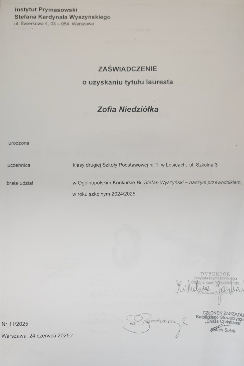 Rozstrzygnięto Ogólnopolski Konkurs Wiedzy o Prymasie Kardynale Stefanie Wyszyńskim. W gronie najlepszych znalazła się Zofia Niedziółka, uczennica Szkoły Podstawowej nr 1 w Łosicach.